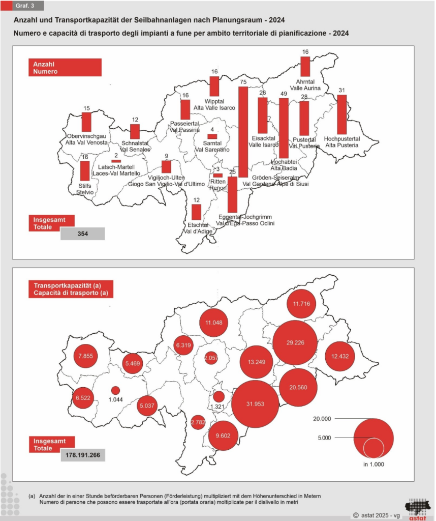 Die Gesamtförderleistung der Anlagen beträgt 559.250 Personen pro Stunde, davon entfallen 71,9 Prozent auf kuppelbare Umlaufbahnen. Der leistungsstärkste Planungsraum ist Gröden-Seiseralm mit 122.531 P/h. Im Schnitt kann jede Anlage 1.580 P/h befördern. Der Auslastungsgrad liegt landesweit bei 25,8 Prozent, mit Spitzenwerten in Gröden-Seiseralm (31,9 Prozent).