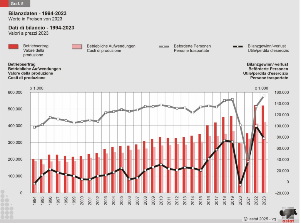 Die Seilbahnunternehmen erwirtschafteten 2023 einen Gewinn von 77,6 Millionen Euro, bei stabilen Erträgen (522 Mio. Euro) und Aufwendungen (422 Mio. Euro). Die Investitionen stiegen um 54,1 Prozent auf insgesamt 161 Millionen Euro, wovon 103 Mio. auf Infrastruktur entfielen.