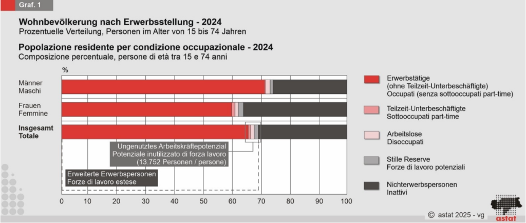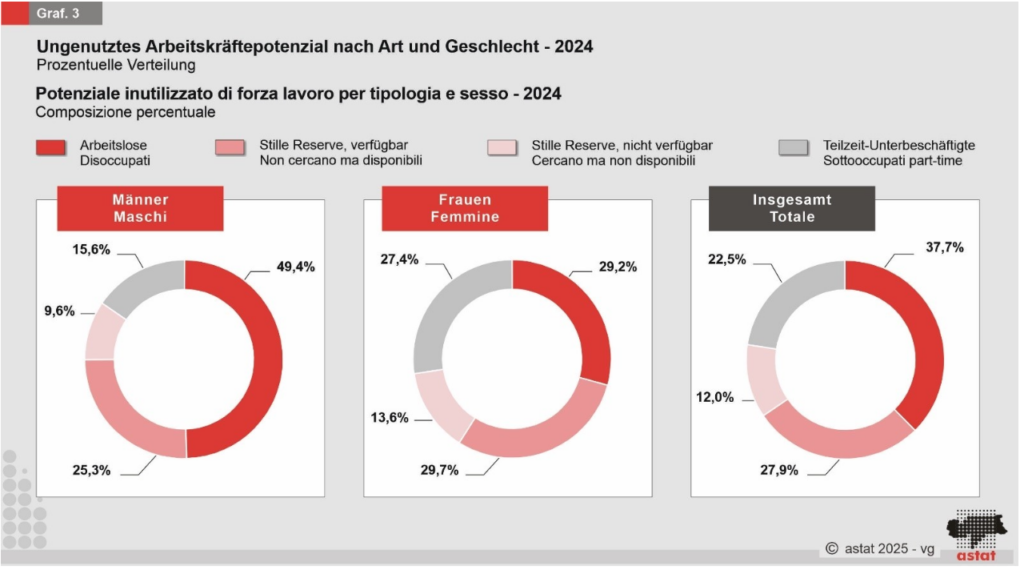 Der von Eurostat als „labour market slack“ bezeichnete Indikator berücksichtigt auch jene Menschen, die bereit wären zu arbeiten, aber keine Beschäftigung finden oder derzeit nicht aktiv suchen. Besonders bei den Frauen zeigt sich laut ASTAT ein differenzierteres Bild als bei den Männern.