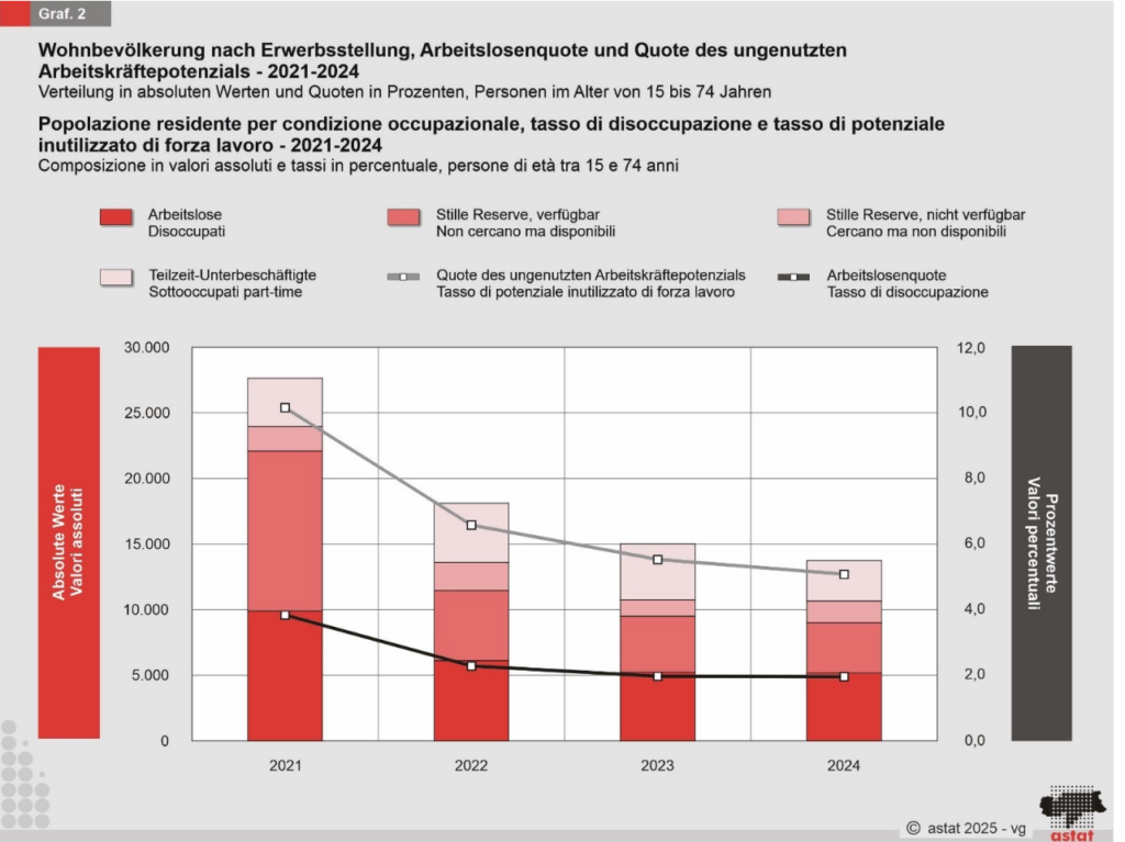 Zwischen 2021 und 2024 hat sich das ungenutzte Arbeitskräftepotenzial in Südtirol halbiert – von 27.643 auf 13.752 Personen. Dieser Rückgang betrifft: