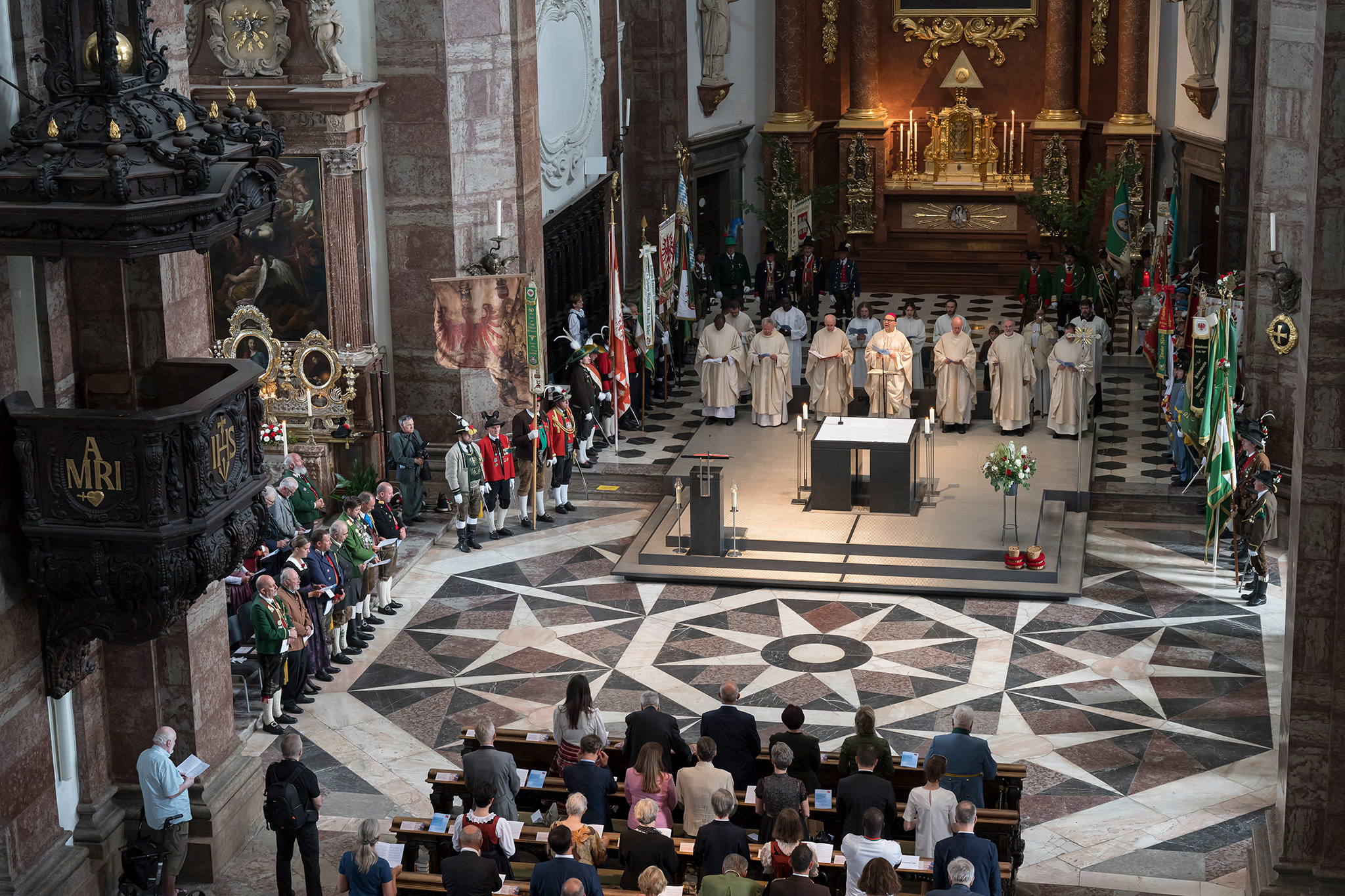 Con una solenne celebrazione nella Chiesa dei Gesuiti a Innsbruck, l’intera Terra tirolese ha commemorato la sua radicata tradizione di fede ed ha rinnovato il solenne voto del 1796. La giornata è iniziata con il tradizionale Landesüblicher Empfang in piazza Karl-Rahner, davanti alla Chiesa dei Gesuiti. Ai comandi del Mjr. Thomas Saurer, erano presenti la Schützenkompanie Amras, la MK Amras, le tre Bundesfahnen (le bandiere delle federazioni Schützen del Tirolo), oltre alle delegazioni di diverse Compagnie e associazioni tradizionali.