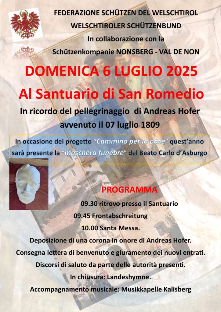 Si terrà domenica 6 luglio presso il Santuario di San Romedio la tradizionale commemorazione del pellegrinaggio di Andreas Hofer al luogo di preghiera, avvenuta il 7 luglio 1809. In occasione del progetto „Cammino per la Pace“, quest’anno alla cerimonia sarà presente la maschera funeraria del Beato Carlo d’Asburog.