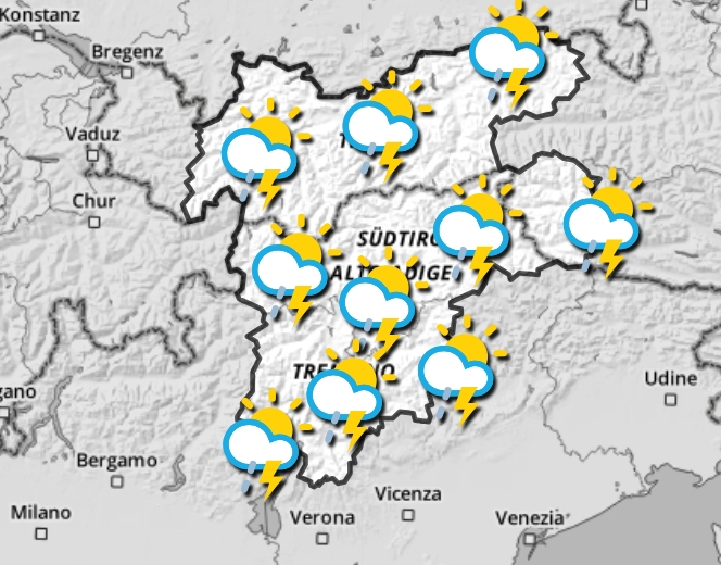 A sud delle Alpi graduale peggioramento: in parte soleggiato al mattino, probabilità di temporali in aumento al pomeriggio e soprattutto in serata. Temporali pomeridiani anche in Osttirol e lungo la cresta alpina, mentre verso nord il tempo dovrebbe rimanere asciutto fino a sera grazie al föhn.