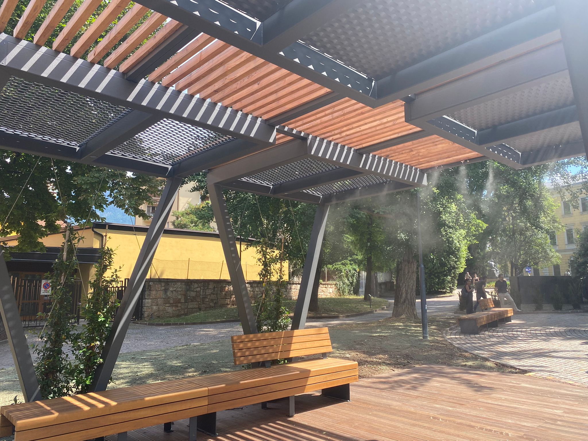È qualcosa di più di un parco del tutto rinnovato quello che, insieme all’area giochi della vicina piazza Garzetti, è stato inauguratonei giorni scorsi a Trento in Largo Pigarelli. In questi giorni di gran caldo, nell’area verde davanti al tribunale si sperimentano infatti alcune soluzioni che possono aiutare la città ad affrontare le conseguenze del cambiamento climatico: si tratta del prototipo di una pergola ombreggiante in acciaio con nebulizzatori rinfrescanti e di una fontana a pavimento, elemento giocoso che richiama la memoria storica della presenza delle rogge.