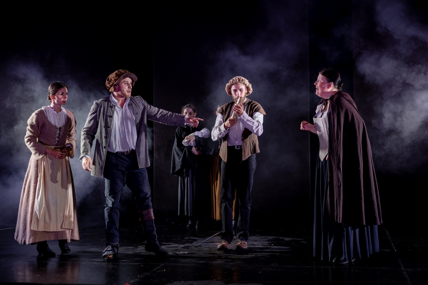 Proveniente dal teatro popolare si distingue soprattutto Oliver Pezzi della Pusteria nel ruolo dell’arcivescovo Sprenz, con una performance straordinaria. Da non perdere anche Karin Lintner di Terlan nel ruolo di Melli e Robert Bernardi di Marling nel ruolo di assessore alla cultura, Maria Theresia Platter di Gargazon nel ruolo di Katherina Hutter, Sabrina Waldner di Merano e Robert Zingerle di Bolzano. Iann Marsana di Obermais, nel ruolo del giovane arciduca Ferdinando, può essere considerato la grande scoperta di questa produzione, insieme a Joselin Gomez-Biamon di Wolkenstein: questi due giovani attori salgono per la prima volta sul palco e convincono immediatamente. Lo stesso vale per Hanna Zagler e Johanna Pixner nei ruoli delle bambinaie di Magdalena e Michael Gaismair. Sono giovani talenti scoperti dal Merano Teatro Festival, che qui hanno l’opportunità di esibirsi per la prima volta su un grande palcoscenico, un merito del festival, questo, che accresce ulteriormente il suo valore.