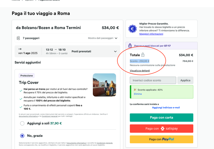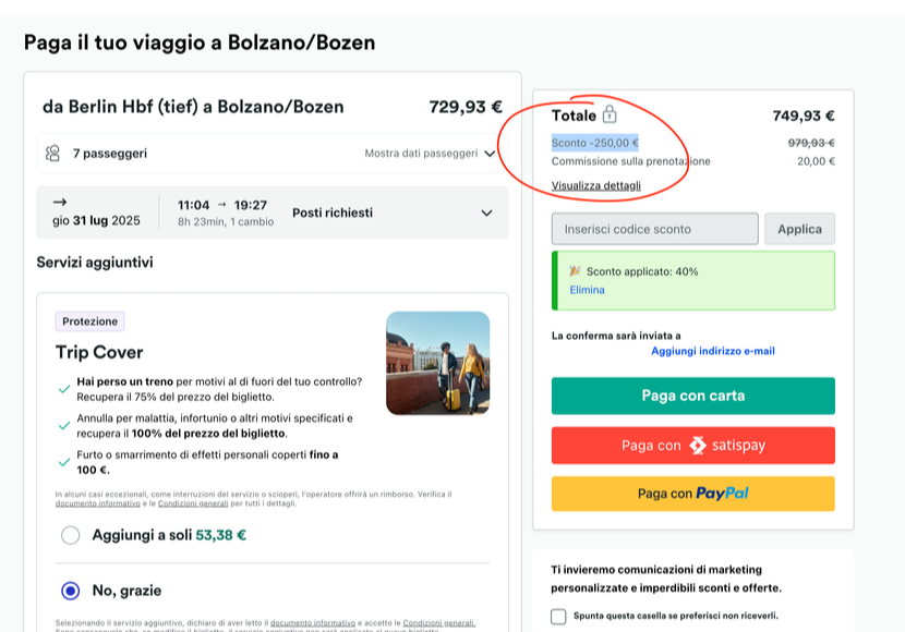 Besonders brisant: Der verwendete Rabattcode „ALTOADIGE40“ ist nicht an eine tatsächliche Übernachtung oder einen Aufenthalt in Südtirol gebunden – jeder kann ihn einlösen, solange die Buchung über einen Südtiroler Bahnhof läuft. So sei es möglich, dass etwa ein Tourist aus Berlin auf dem Weg nach Rom einfach „Bozen“ als Zwischenhalt angibt und den Rabatt in voller Höhe kassiert – ohne je in Südtirol auszusteigen. Ein echter Nutzen für die Region sei so nicht erkennbar, kritisiert die Süd-Tiroler Freiheit.