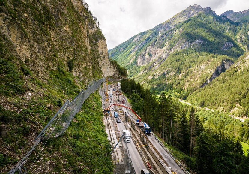 Bevor überhaupt Beton gegossen werden konnte, musste der Baugrund abgesichert werden: In bis zu 200 Meter hohen Felswänden wurden lose Gesteinsformationen beseitigt, ein 70 Meter hoher Felsturm entfernt und insgesamt 850 Meter Steinschlagschutzzäune errichtet. Zusätzlich wurden 5.000 Quadratmeter Felsfläche mit Spezialnetzen stabilisiert – ein enormer Aufwand, der sich laut Günter Guglberger, Leiter der Abteilung Landesstraßen, aber „als absolut notwendig für den sicheren Baufortschritt erwiesen hat“.