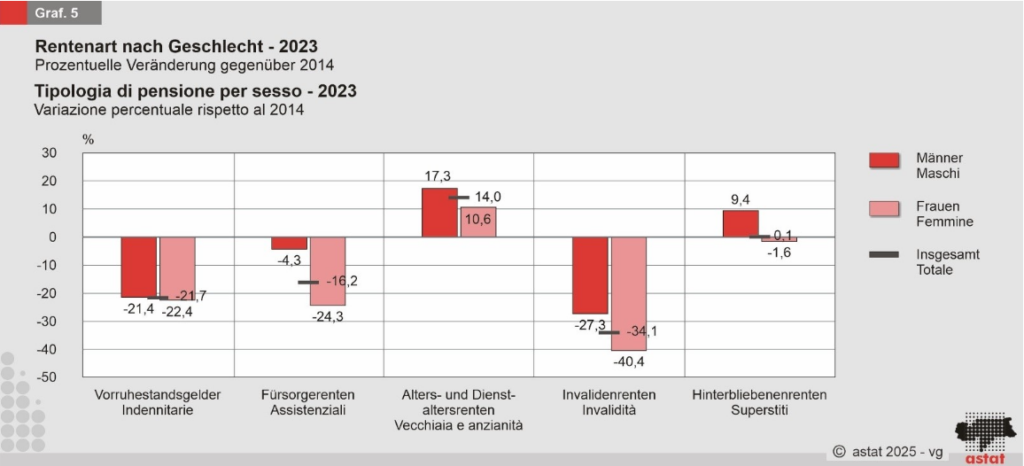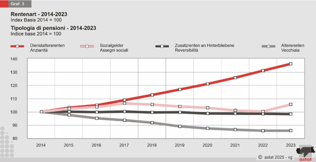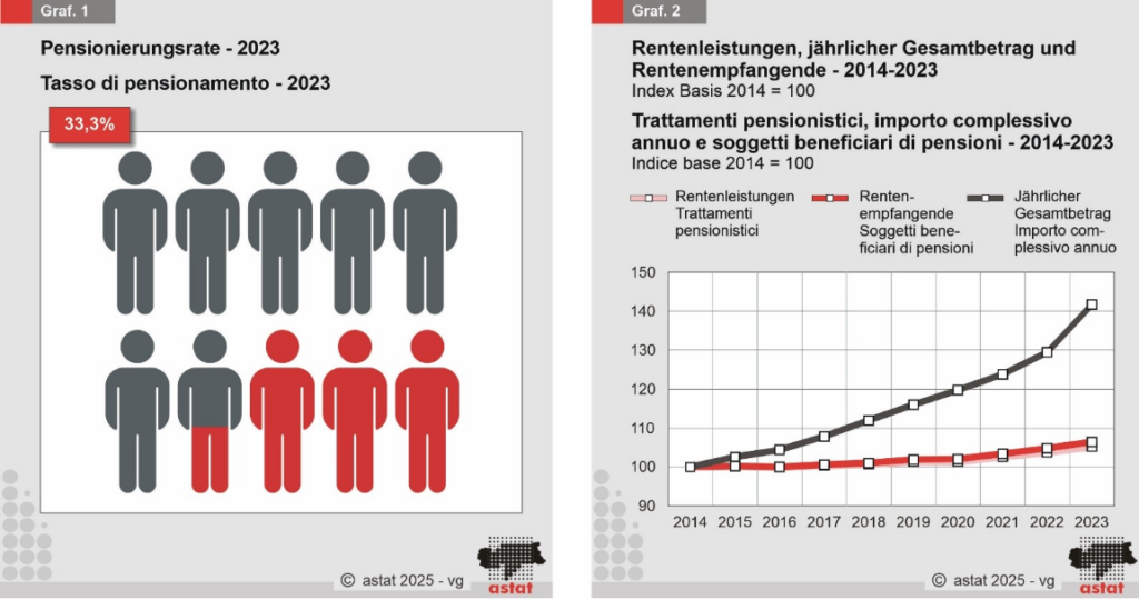 Der Rentenanteil am BIP ist in Südtirol mit rund zehn Prozent seit Jahren der niedrigste in Italien. Der nationale Durchschnitt lag bei 16,2 Prozent. Die Pensionierungsrate war in Südtirol mit 33,3 Prozent ebenfalls niedrig. Nur Kampanien liegt mit 32,8 Prozent noch darunter.Der italienweite Durchschnitt beträgt 38,2 Prozent.