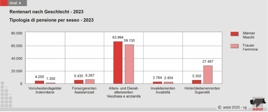 Die höchsten Renteneinkommen wurden in Bozen bezogen (Durchschnitt 26.680 Euro; Median 23.683 Euro), während im Vinschgau die Renten am niedrigsten waren (Durchschnitt 20.053 Euro; Median 17.385 Euro).