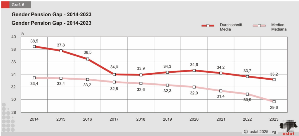 Der sogenannte „Gender Pension Gap“, also die Rentenlücke zwischen Frauen und Männern, war weiterhin groß, wenn auch rückläufig. Der Unterschied bei den durchschnittlichen Renten liegt 2023 bei 29,6 Prozent, der Median sogar bei 33,2 Prozent.