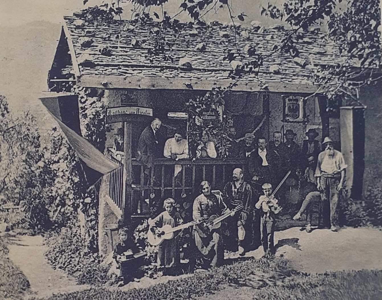 Benn ber nöu meher zurück en de Zait geha‘, en Johr naenzehnhundertoerlewa, en Johr wan Foto wan Birt „ Gasthaus zum Tiroler Adler“, en Garait hob’n olla de Lait Taitsch klofft, onda s Taitsch g’sungen, hait niemed meher.