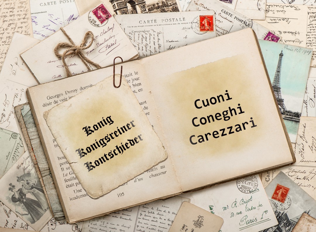 König (a volte trascritto come Konig senza umlaut) ha un significato abbastanza chiaro e diretto: in tedesco significa „re“. Deriva dal medio alto tedesco „künic“ o „könic“, che significava appunto re, sovrano. È un cognome occupazionale o simbolico: può riferirsi a qualcuno che ricopriva un ruolo importante nella comunità (simbolicamente „re“) o partecipava a giochi o feste popolari dove si eleggeva un „re“ (come il Re del Carnevale) oppure lavorava per la casa reale o aveva legami con la nobiltà. L’ometto italico derivò dal personale Chunico da Ku(o)n, l’italianizzazione in Cuoni o Coni… Königsrainer, invece, tipico di aree germanofone alpine, il “nostro” lo liquidò con un malsano Cóneghi riprendendo di fatto lo stesso concetto attribuito a Konig. Königsrainer è un cognome toponimico, cioè, derivato da un luogo o da una caratteristica geografica. Königs = genitivo di „König“, ovvero „del re“. Rainer o Rain = in tedesco antico o dialettale significa margine, bordo, oppure può riferirsi a un declivio, zona di confine, terreno ai margini di un bosco o di un campo. Quindi Königsrainer potrebbe significare: „colui che viene dal luogo ai margini (Rain) del re“, oppure, „abitante della terra del re vicino al confine o al margine“.
