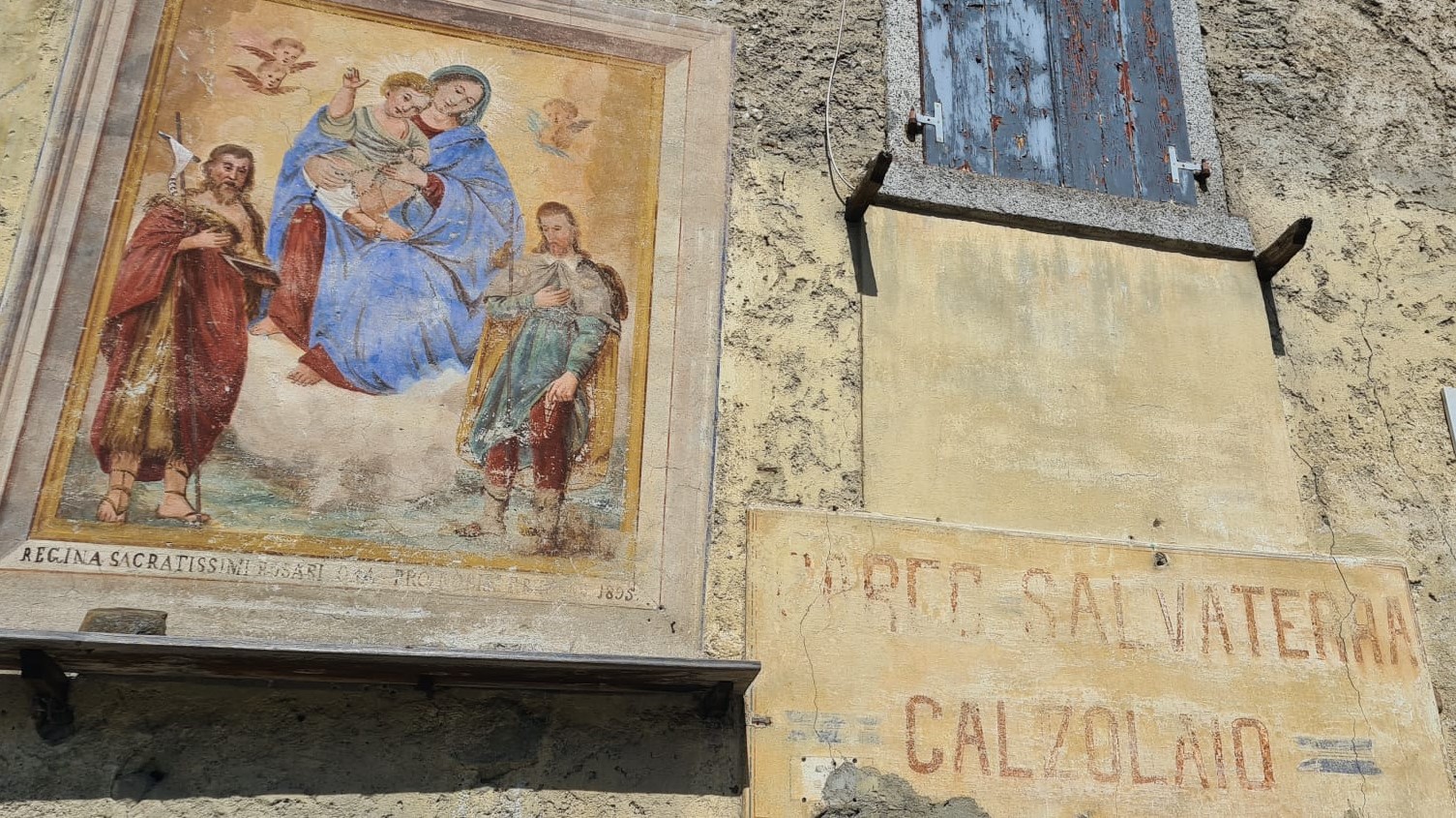 L’affresco che raffigura Maria „Regina del Santissimo Rosario“, invocando la sua preghiera per tutti noi, risale al 1895. La Madonna ammantata d’azzurro sorride, circondata dagli angeli. E‘ il Bambino a benedire chi si raccoglie in preghiera ai piedi dell’immagine sacra. Sulla stessa facciata, un dipinto più antico, quasi completamente cancellato dal tempo, seminascosto dal tubo della grondaia, raffigura un … San Cristoforo? San Rocco? Non siamo riusciti ad interpretarlo.