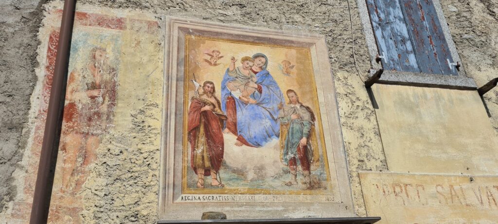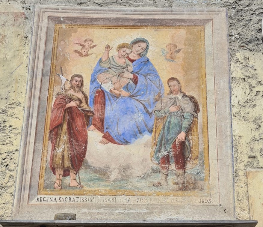 L’affresco che raffigura Maria „Regina del Santissimo Rosario“, invocando la sua preghiera per tutti noi, risale al 1895. La Madonna ammantata d’azzurro sorride, circondata dagli angeli. E‘ il Bambino a benedire chi si raccoglie in preghiera ai piedi dell’immagine sacra. Sulla stessa facciata, un dipinto più antico, quasi completamente cancellato dal tempo, seminascosto dal tubo della grondaia, raffigura un … San Cristoforo? San Rocco? Non siamo riusciti ad interpretarlo.