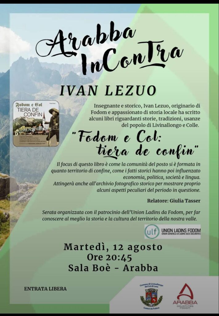 Per la serie di eventi „Arabba incontra“, domani sera, martedì 12 agosto, l’ospite e relatore sarà Ivan Lezuo. Insegnante e storico, Lezuo, originario di Fodom e appassionato  di storia locale, ha scritto diversi libri riguardanti storie, tradizioni, usanze del popolo di Livinallongo e Colle.