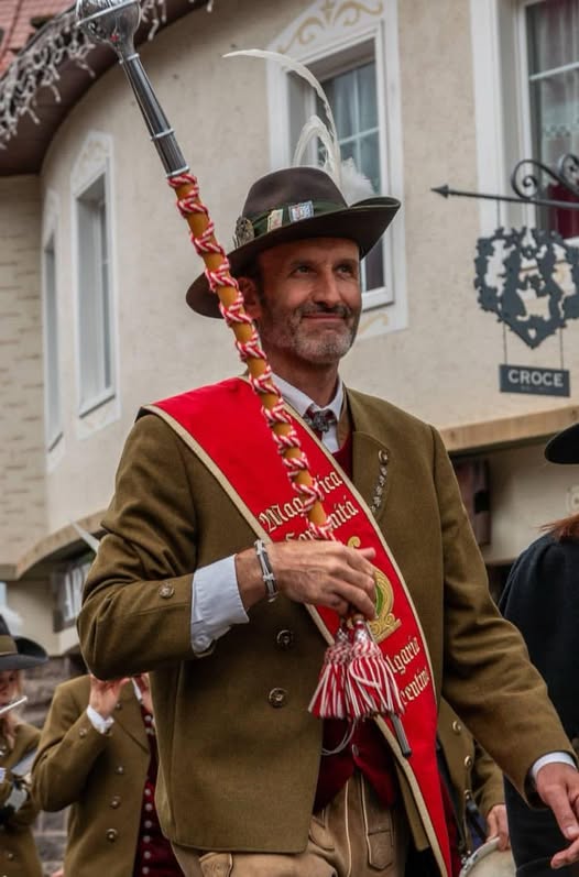 Solo qualche settimana fa, invece, è Giuseppe Ferraro „Kest“, il mitico mazziere della Banda Folkloristica di Folgaria, nonchè presidente dell’Associazione Mazzieri provinciale, che tanto ha fatto e tanto ancora sta facendo per la Musik in Bewegung, la musica in movimento che affonda le sue radici nella storia e nella tradizione della nostra Terra, ad avere un’idea. Lui e la Banda chiedono al Comitato Avez del Prinzep un altro pezzo di legno, da affidare all’artista del tornio Tiziano Pulcini, perchè ne ricavi una mazza, lo „strumento“ con cui il mazziere, appunto, guida la banda durante le sfilate e le esibizioni musicali „in movimento“.