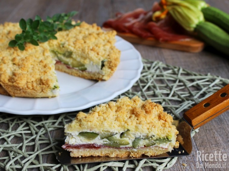 Mondare le zucchine e tagliarle a fettine sottili. In una ciotola unire la farina, il grana, l’olio, l’acqua, il sale e il pepe. Mescolare il tutto fino a ottenere una pastella liscia. Aggiungere le zucchine e mescolare. Trasferire metà del composto ottenuto in una padella antiaderente precedentemente unta con poco olio. Adagiarvi sopra le 4 fette di formaggio e coprire con il composto di zucchine restante. Spolverizzare con pangrattato, irrorare con un filo d’olio e porre sul fuoco. Cuocere, coperto e fiamma bassa, per un totale di 25 minuti avendo cura di girare la torta salata a metà cottura.