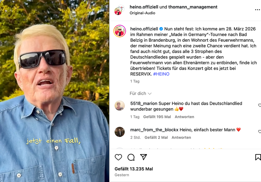 Heino will den Feuerwehrmann deshalb bald persönlich treffen – spätestens am 28. März 2026, wenn seine Tour „Heino – Made in Germany“ in dessen Heimatort Halt macht.