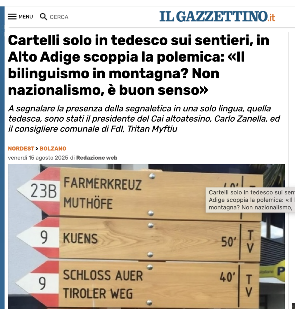 Anlass für den reißerischen Bericht: In manchen Gebieten sind die hölzernen Wanderwegschilder ausschließlich in deutscher Sprache beschriftet. Laut Il Gazzettino sei dies „gegen Gesetz und gesunden Menschenverstand“.