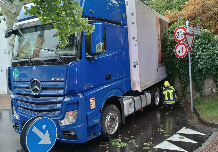 Am Sattelschlepper entstanden leichte Schrammen und Schleifspuren an Hänger und Zugmaschine, berichtet die FF Bruneck. Größere Schäden blieben aus.