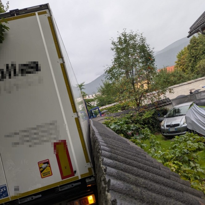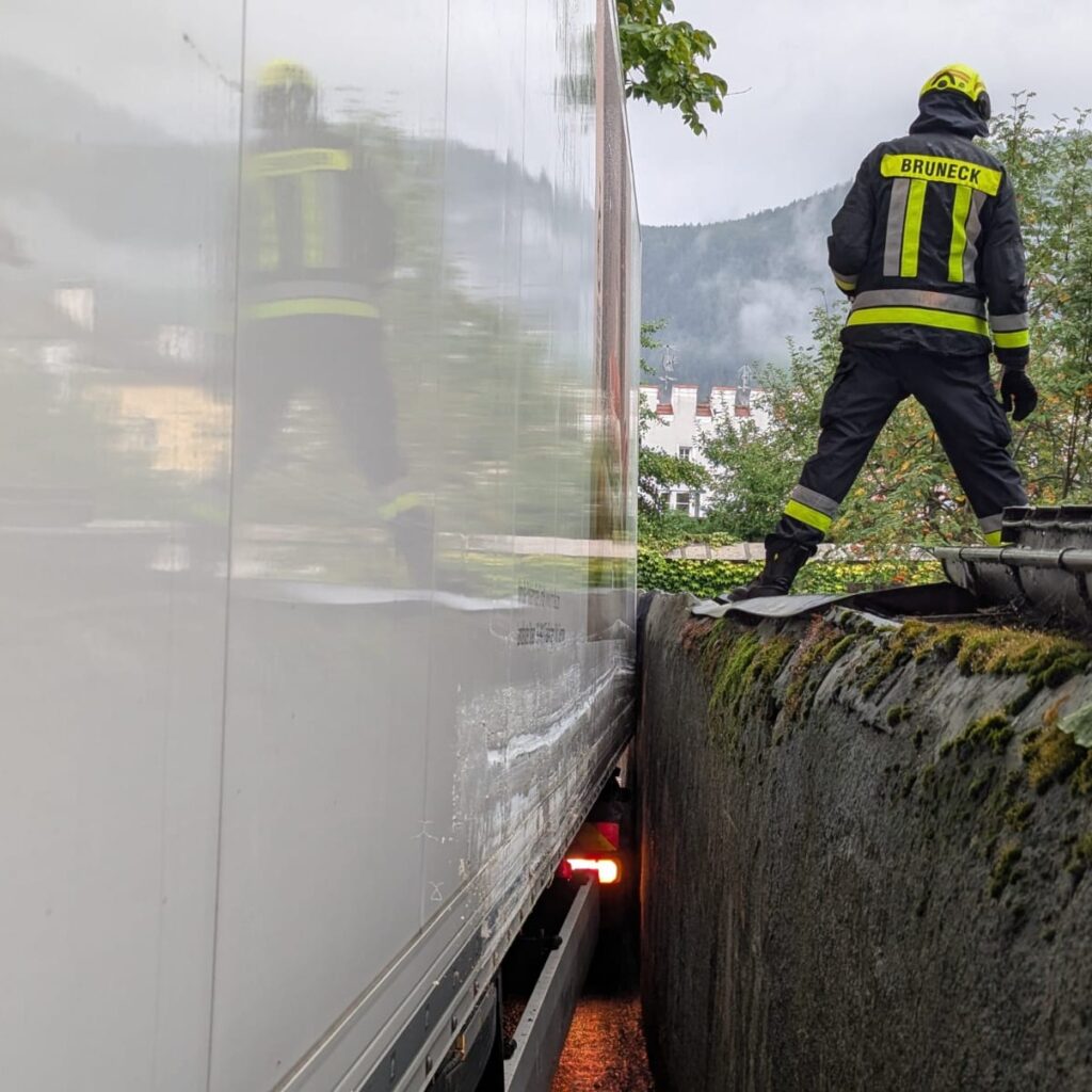 Am Sattelschlepper entstanden leichte Schrammen und Schleifspuren an Hänger und Zugmaschine, berichtet die FF Bruneck. Größere Schäden blieben aus.