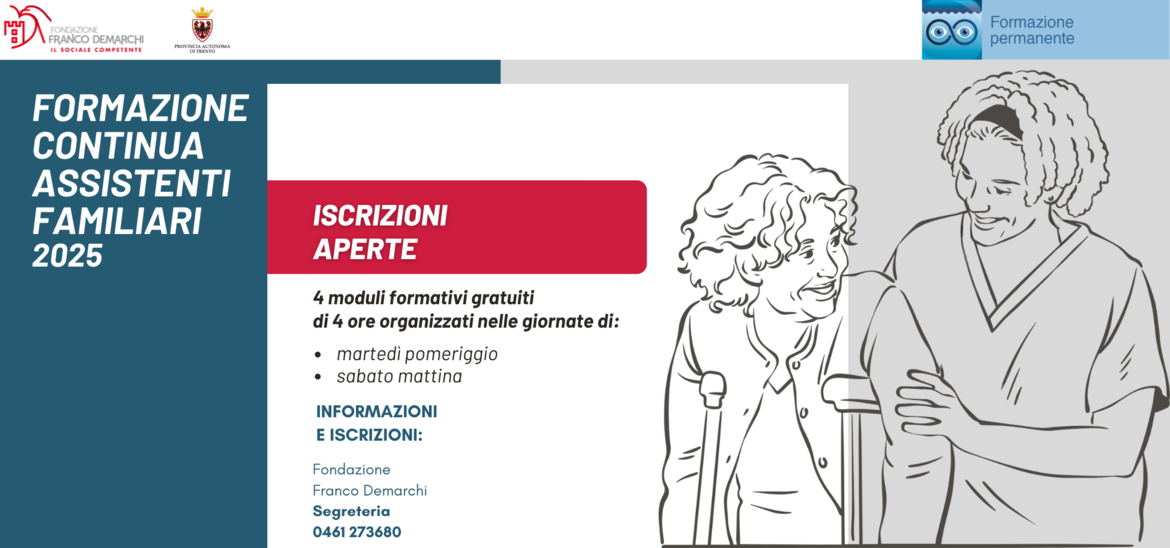 Mantenere aggiornate le proprie competenze è fondamentale per garantire interventi assistenziali professionali e di qualità , capaci di considerare la persona assistita nella sua complessità . Anche per l’autunno Fondazione Franco Demarchi, forte della propria esperienza nella formazione in ambito socio-assistenziale e socio-sanitario, propone un nuovo ciclo di incontri formativi, realizzati in collaborazione con il Servizio Politiche Sociali della Provincia autonoma di Trento.