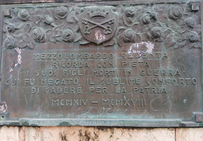 In Mezzolombardo ist bereits das Geld für die Renovierung des Kriegerdenkmals genehmigt, stellt Marcello Delucca fest. Auch hier ein ähnlicher geschichtsverdrehende Text: „Mezzolombardo erlöst (?) erinnert sich mit Mitleid an seine Söhne, die im Krieg starben und denen der erhabene Trost verwehrt blieb, für ihr Vaterland (= Italien) zu sterben.“ Danach folgt natürlich eine faschistische Heroisierung der italienischen Soldaten „Ruhm und Dankbarkeit der patriotischen Armee, die dieses Land mit immensen Opfern und ebenso viel Tapferkeit aus seiner harten und langen Knechtschaft befreit hat.“