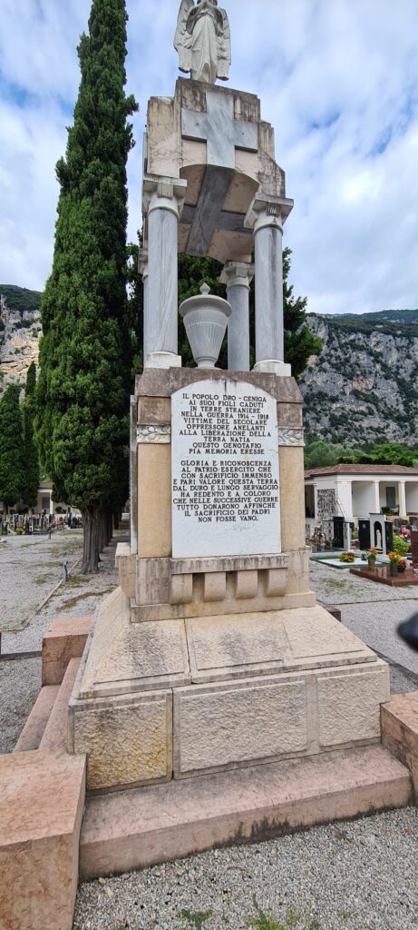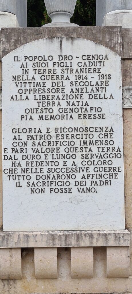 So ist zum Beispiel im Friedhof von Dro-Ceniga zu lesen ist: „Die Einwohner von Dro-Ceniga errichteten dieses Kenotaph in frommer Erinnerung an ihre Söhne, die im Krieg von 1914 bis 1918 in fernen Ländern fielen, Opfer der jahrhundertealten Unterdrücker, die sich nach der Befreiung ihres Heimatlandes sehnten.“ Dann folgt natürlich eine faschistische Heroisierung der italienischen Soldaten „Ruhm und Dankbarkeit der patriotischen Armee, die dieses Land mit immensen Opfern und ebenso viel Tapferkeit aus seiner harten und langen Knechtschaft befreit hat.“