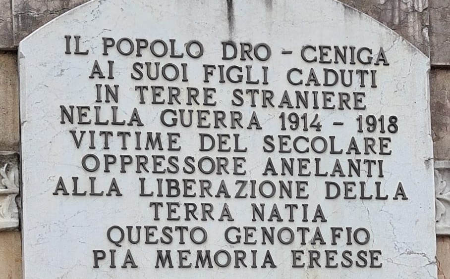 Così, ad esempio, nel cimitero di Dro-Ceniga si legge: “Gli abitanti di Dro-Ceniga eressero questo cenotafio in pia memoria dei loro figli, che nella guerra 1914-1918 caddero in terre lontane, vittime dei secolari oppressori, anelanti alla liberazione della loro patria.” Segue poi un’eroicizzazione fascista dei soldati italiani: “Gloria e gratitudine all’esercito patriottico che con immensi sacrifici e con altrettanto valore liberò questa terra dalla sua dura e lunga schiavitù.” (NdR: di questo monumento abbiamo scritto la settimana scorsa qui su UT24 per la rubrica Briciole di Memoria)