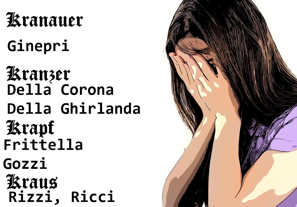 Kranauer (e varianti come Kronauer, Krönauer, Kraner, Krenauer ma anche Kranebitter e Kranewitter) per l’ometto onomasticida avrebbero dovuto modificarsi in “Ginepri” … Definirlo bizzarro è un eufemismo, ovviamente. Il cognome è legato a un nome di luogo: Kronau. Una variante altomedievale apparsa nei documenti come „Kranauer“ già nel XIV secolo suggerisce un’origine toponomastica: la persona proveniva da un luogo chiamato Kronau o simile. Nell’area tedesca e austro-svizzera ha una particolare diffusione. Da dove sia saltato fuori il “Ginepri” è davvero inspiegabile. Kranzer è estremamente raro: vi risultano poche famiglie, concentrate prevalentemente nella provincia di Bozen in particolare a Meran e Sarnthein. Kranzler (che può essere confuso con “Kranzer”) è un cognome tedesco che deriva da “ghirlanda” (kranz) e significava chi produceva ghirlande o, per estensione, viveva in una casa contraddistinta da un’insegna con ghirlanda e forse per questo l’omo italico optò per Della Corona o Della Ghirlanda.