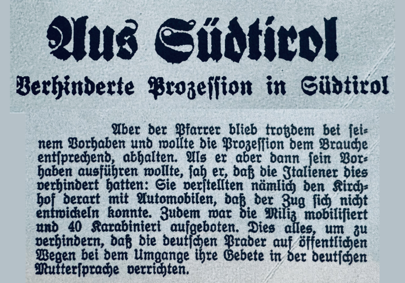 Als der Pfarrer die Prozession trotzdem abhalten wollte, versperrten Italiener den Kirchhof mit Automobilen und ein Aufgebot der faschistischen Miliz sowie 40 Carabinieri verhinderten den Umzug.