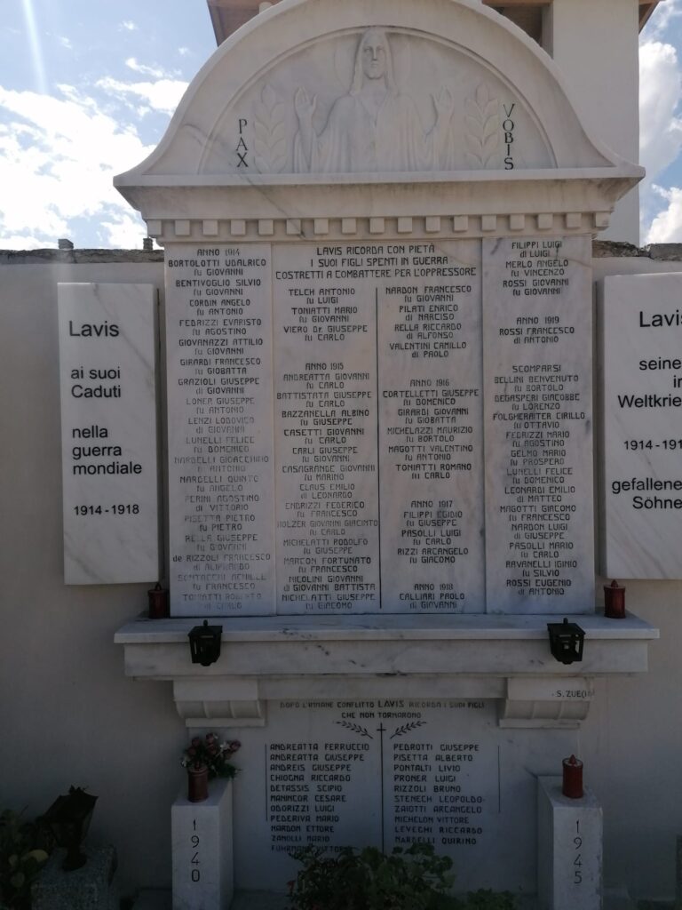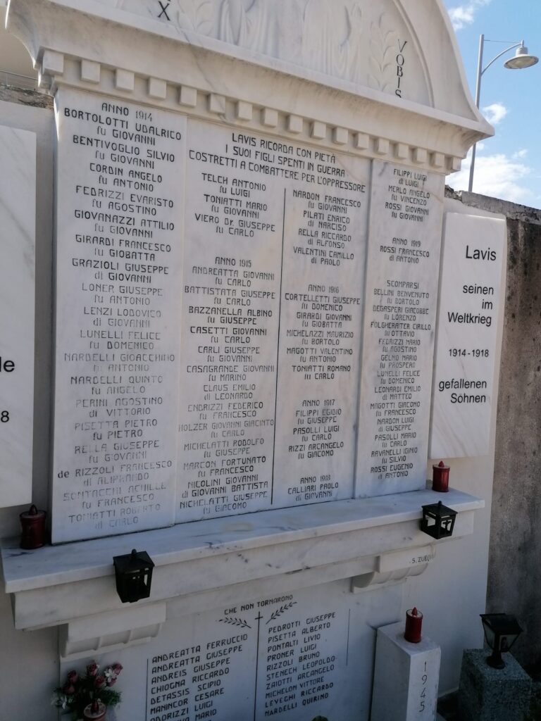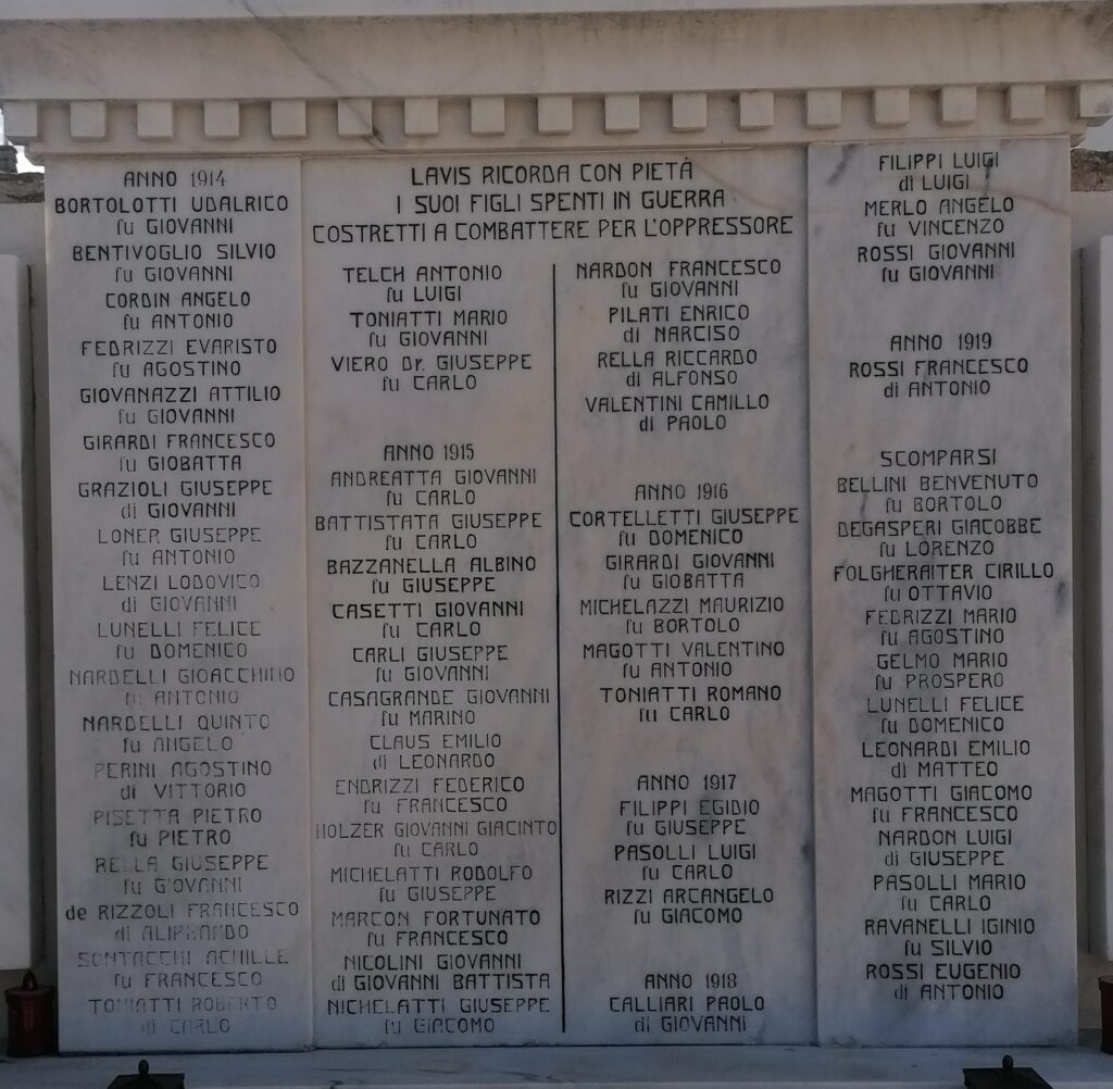 Ai lati del cippo, due „ali“ collocate in seguito, rendono almeno in parte  giustizia ai lavisani morti indossando la divisa austriaca: riportano infatti la scritta „Lavis ai suoi Caduti nella guerra mondiale 1914 – 1918“; in tedesco invece l’epigrafe parla di „gefallene Söhne / figli caduti2 come in quella prevista in origine“.
