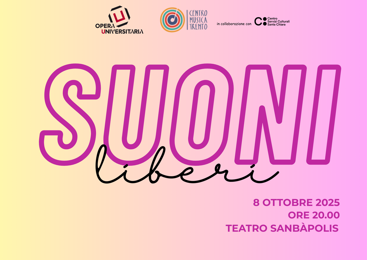 Riparte la stagione della musica al Teatro Sanbàpolis, con la seconda edizione di “Suoni liberi”, il progetto realizzato da Opera Universitaria ed il Centro Musica del Comune di Trento, con la collaborazione del Centro Servizi Culturali Santa Chiara, per dare la possibilità a chi lo desidera di salire su un palco e provare l’emozione di esibirsi davanti ad un pubblico. Il 18 settembre la scadenza per iscriversi.