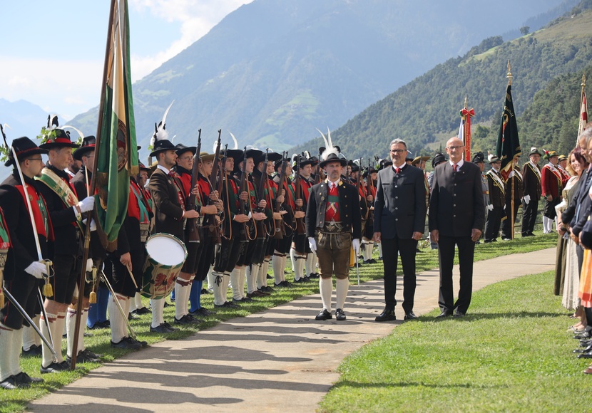 Der Festakt begann mit einem landesüblichen Empfang für die Landeshauptleute sowie die Ehrengäste. Für die feierliche Umrahmung sorgten die Musikkapelle Proveis und eine Ehrenformation des Schützenbezirks Burggrafenamt/Passeier.