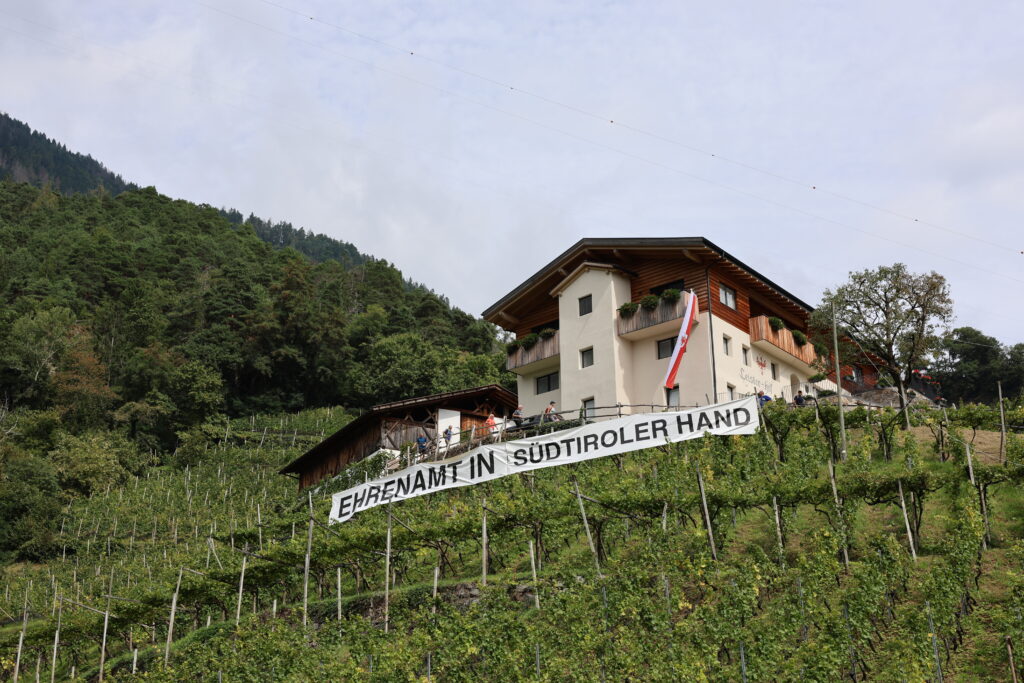 Im Rahmen der Feierlichkeiten nutzte der Schützenbezirk die Gelegenheit, beim angrenzenden Weingut Loaster-Hof erneut das Banner „Ehrenamt in Südtiroler Hand“ anzubringen. Damit wollten die Schützen auf die aktuelle Lage des Ehrenamts aufmerksam machen.