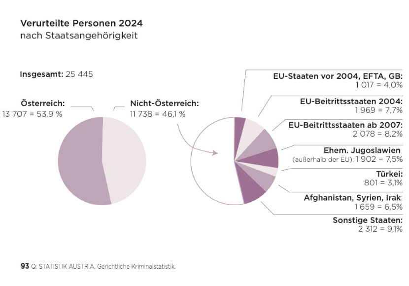 Ein Blick in das „Statistische Jahrbuch Migration & Integration“ bestätigt den Trend: 46,1 Prozent aller Verurteilten im Jahr 2024 waren ausländische Staatsbürger. Besonders auffällig sind Herkunftsländer wie Afghanistan, Syrien und der Irak – sie machen 6,5 Prozent der Verurteilten aus, obwohl sie nur 1,8 Prozent der Bevölkerung stellen.