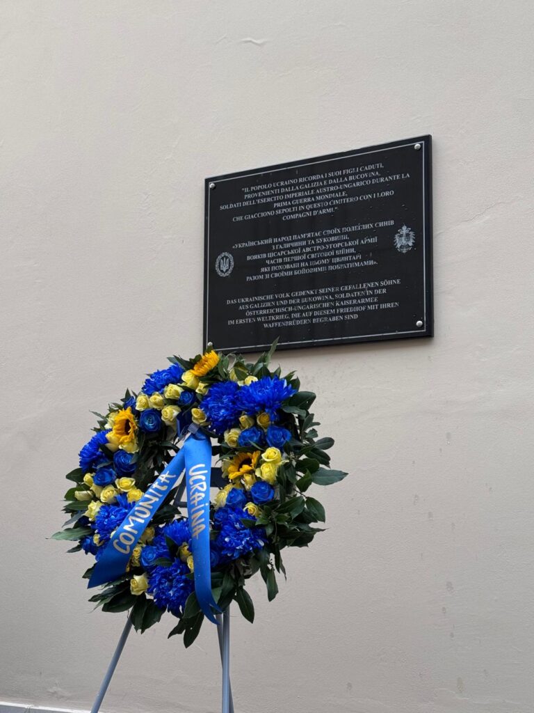 Il popolo ucraino ricorda i suoi figli caduti, provenienti dalla Galizia e dalla Bucovina, soldati dell’esercito imperiale austro-ungarico durante la prima guerra mondiale, che giacciono in questo cimitero con i loro compagni d’arme“ si legge sulla targa. Fra di loro, di soldati imperiali tirolesi di lingua italiana, tedesca e ladina,  tumulati allora nel cimitero di Trento, oggi qui ne sono rimasti ben pochi. La maggior parte di essi,  etichettati volenti o nolenti come „redenti“, sono finiti nell’ossario di Castel Dante.  A quando, in questi che dovrebbero essere luoghi della memoria veramente condivisa,  anche delle targhe che contestualizzino tutto questo, raccontando la nostra vera Storia?