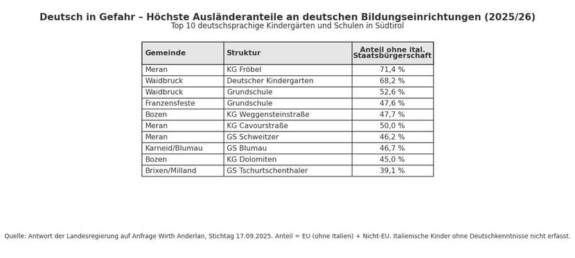 Die Antwort auf Wirth Anderlans Anfrage ist mehr als eine Statistik – sie ist ein Alarmsignal. In immer mehr deutschen Kindergärten und Schulen kippt das sprachliche Gleichgewicht. Deutsch ist vielerorts nicht mehr selbstverständlich, sondern unter Druck. Und weil die Statistik jene Kinder, die italienisch sprechen, aber kein Deutsch können, nicht erfasst, ist die tatsächliche Situation noch weit dramatischer.