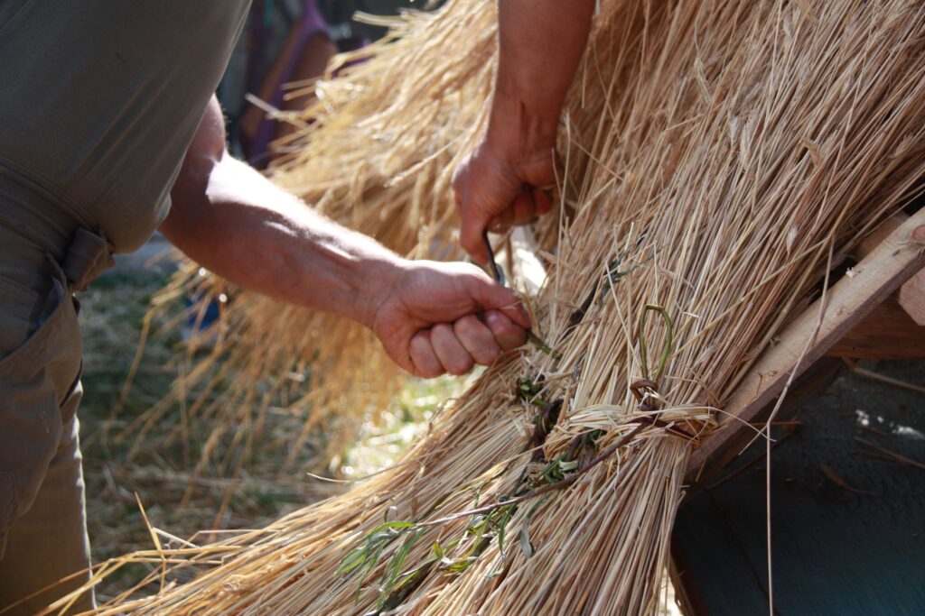 Demonstriert wurde das traditionelle Handwerk von jungen und erfahrenen Fachleuten: Zimmermann Michael Reiterer, einer der wenigen, die dieses Wissen noch beherrschen, zeigte zusammen mit dem Strohdachdecker Franz Pircher die Vorbereitung der Roggenbündel. Am Duregg-Hof veranschaulichten Paul und Christa Lun an einem Holzmodell die Technik der Befestigung der Halme.