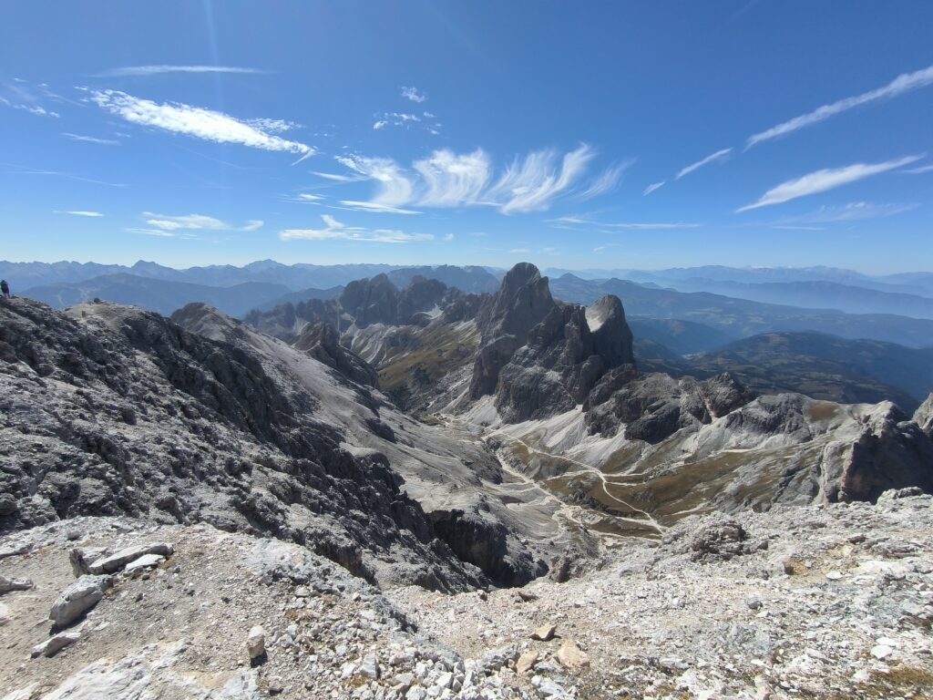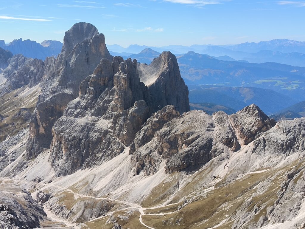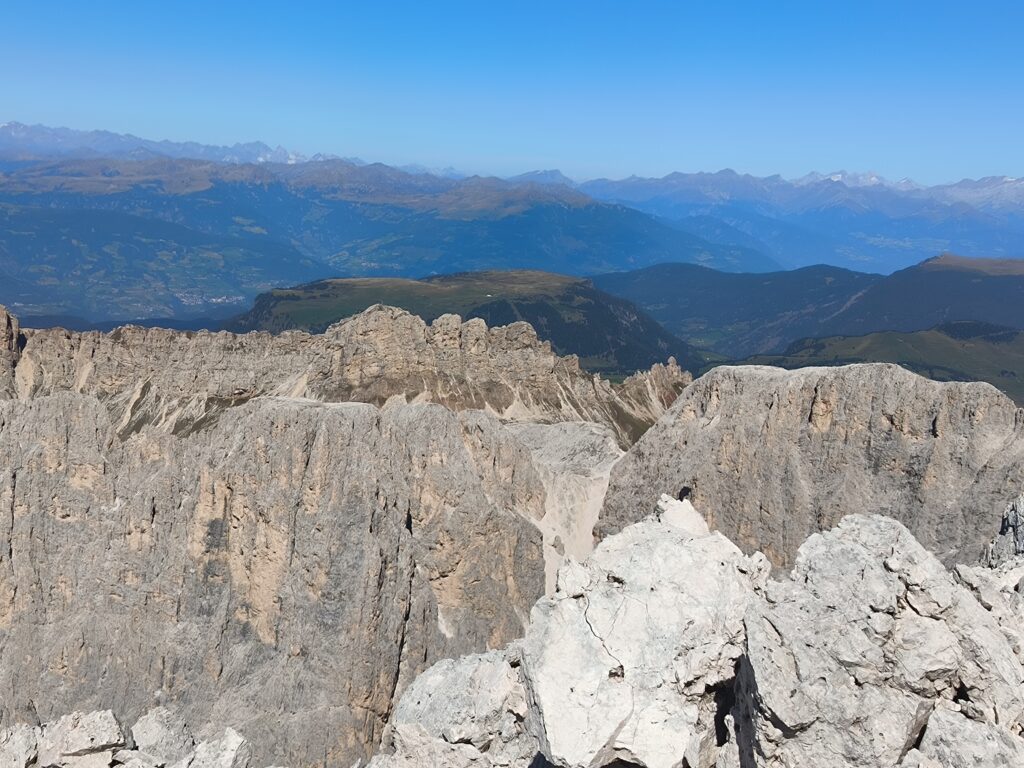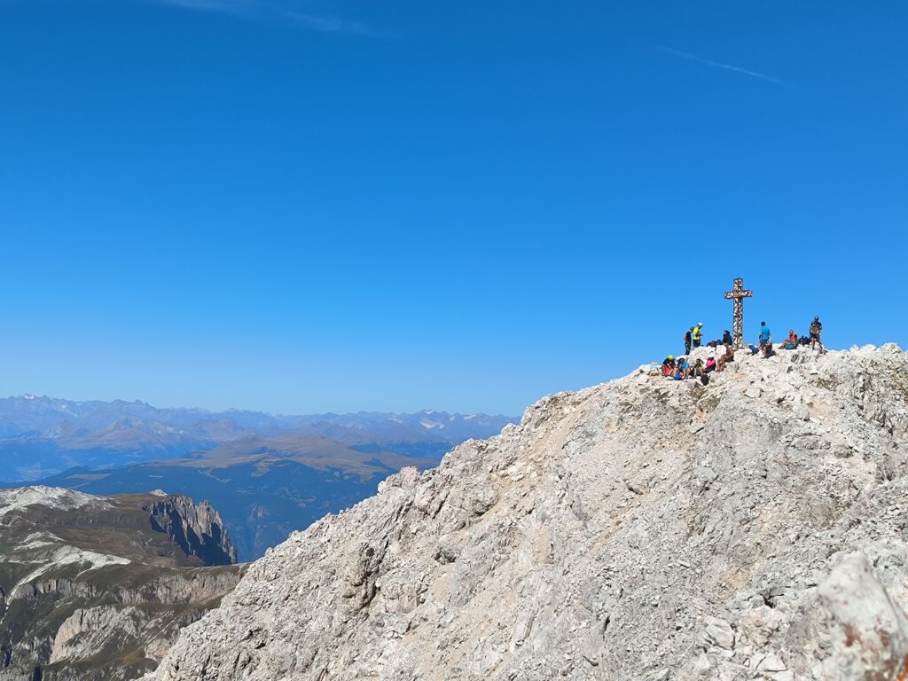 Ma gli occhi non sono ancora sazi. E dunque si sale, ancora. La ferrata (585) è molto verticale ma mai troppo aerea, c’è solo un unico tratto non attrezzato lungo la cresta, prima di raggiungere la cima, dove è necessario prestare molta attenzione. Una volta raggiunta la vetta a 3000 metri è inevitabile una sosta per ammirare il paesaggio a 360 gradi: il Gran Pilastro e il Gran Mesule, le Odle, il Sassolungo e il Sassopiatto, il massiccio del Sella, la Tofana di Rozes, il Sorapiss e l’Antelao, il Pelmo, la Marmolada, il Monte Civetta e il Gran Vernel, la Cima Uomo e le Pale di San Martino, la Cima Scalieret e la Cima d’Asta,  verso sud-est, la Roda di Vael, il Latemar, la Cima Catinaccio propriamente detta, le Torri del Vajolet, l’Adamello, il Cevedale, l’Ortles, il Similaun, lo Sciliar e l’Alpe di Siusi.