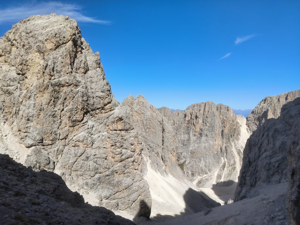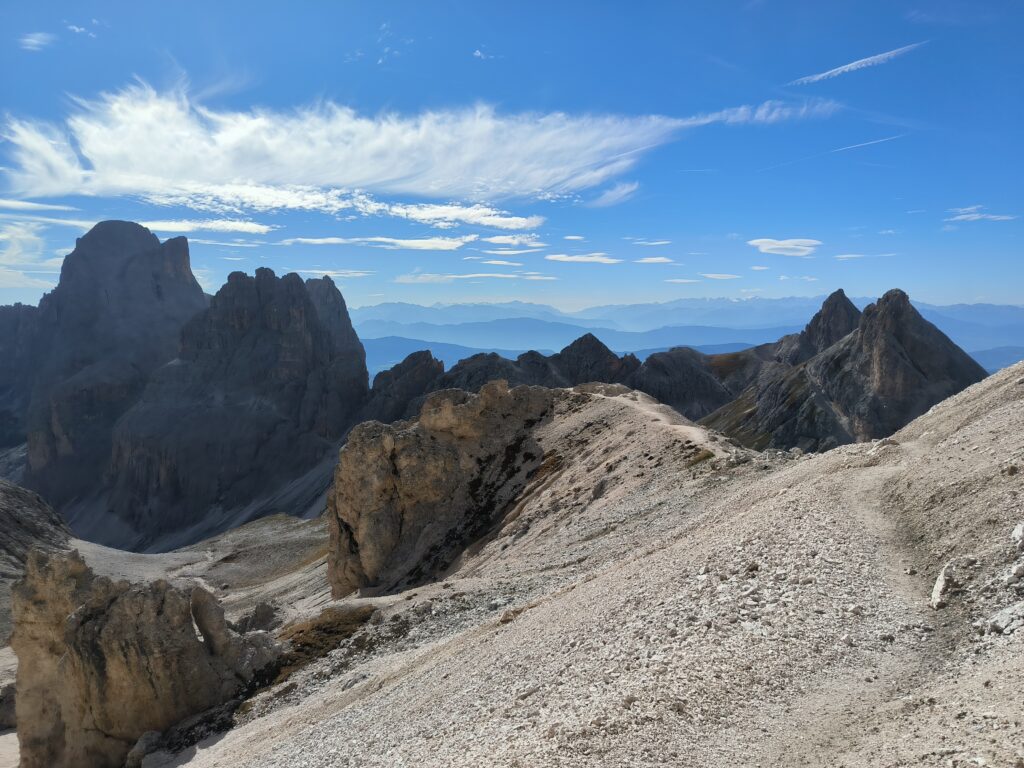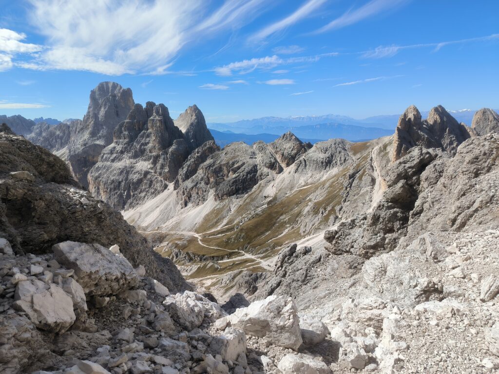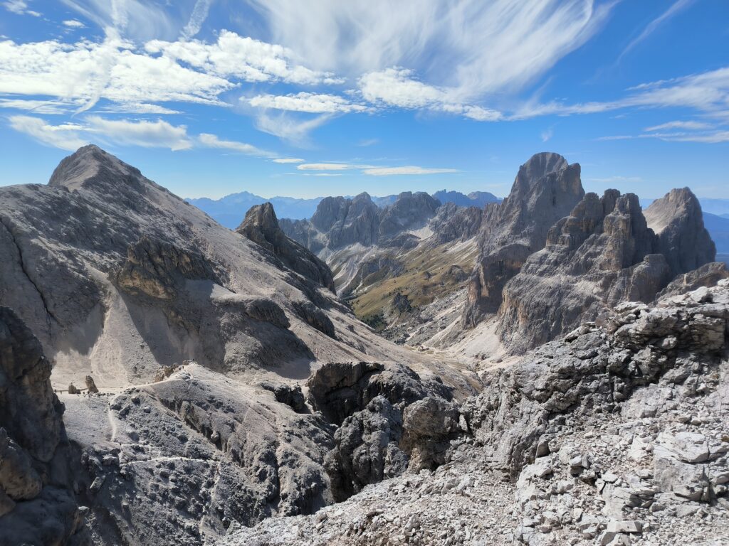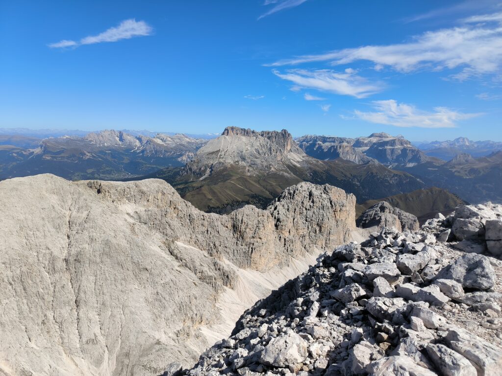Ma gli occhi non sono ancora sazi. E dunque si sale, ancora. La ferrata (585) è molto verticale ma mai troppo aerea, c’è solo un unico tratto non attrezzato lungo la cresta, prima di raggiungere la cima, dove è necessario prestare molta attenzione. Una volta raggiunta la vetta a 3000 metri è inevitabile una sosta per ammirare il paesaggio a 360 gradi: il Gran Pilastro e il Gran Mesule, le Odle, il Sassolungo e il Sassopiatto, il massiccio del Sella, la Tofana di Rozes, il Sorapiss e l’Antelao, il Pelmo, la Marmolada, il Monte Civetta e il Gran Vernel, la Cima Uomo e le Pale di San Martino, la Cima Scalieret e la Cima d’Asta,  verso sud-est, la Roda di Vael, il Latemar, la Cima Catinaccio propriamente detta, le Torri del Vajolet, l’Adamello, il Cevedale, l’Ortles, il Similaun, lo Sciliar e l’Alpe di Siusi.