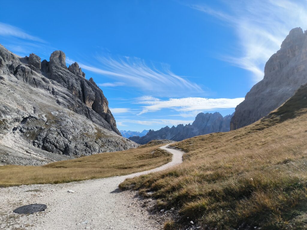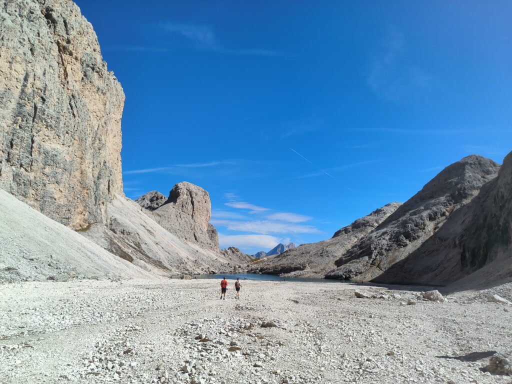 Tuttavia non ci si può fermare a lungo, il percorso richiede ancora tempo ed energie. Si scende, sempre percorrendo un lungo tratto di ferrata verso la vallata che ci porta al Lago d’Antermoia (584) con le sue acque cristalline, dopo una breve sosta e dopo aver percorso le sponde del lago si torna verso il massiccio del Catinaccio, risalendo la lunga serpentina che ci conduce al Passo di Antermoia: è l’ultima intensa salita di giornata.