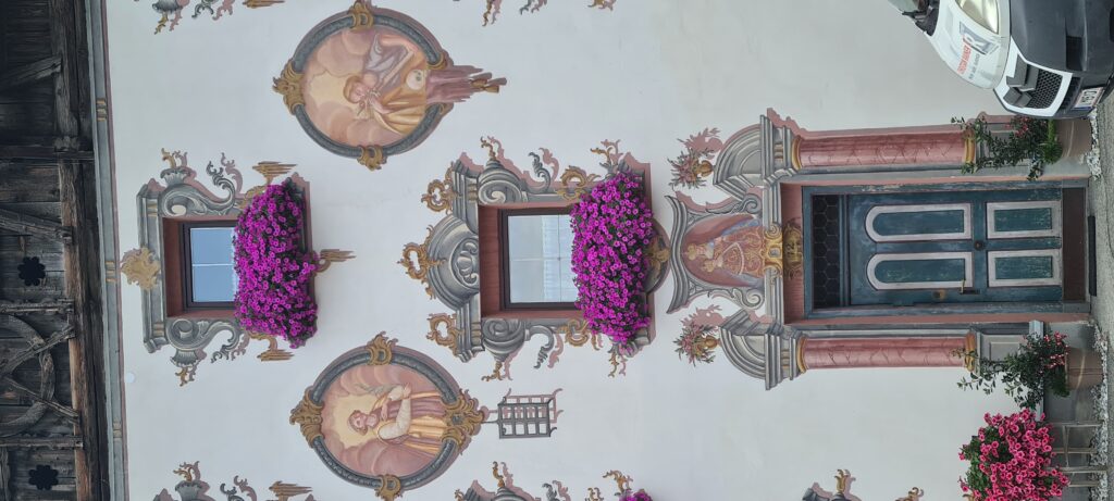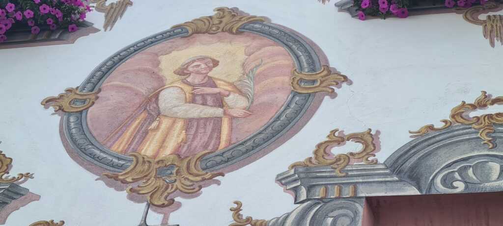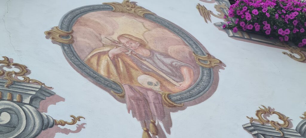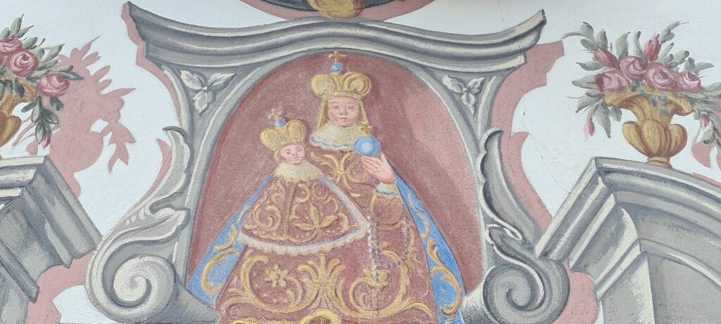 Sopra l’ingresso è rappresentata la Madonna di Waldrast, il santuario fra i monti a poca distanza da qui. A darle man forte, raccogliendo ancora oggi preghiere dagli abitanti della casa e dai viandanti, sono San Lorenzo e Santa Maddalena.