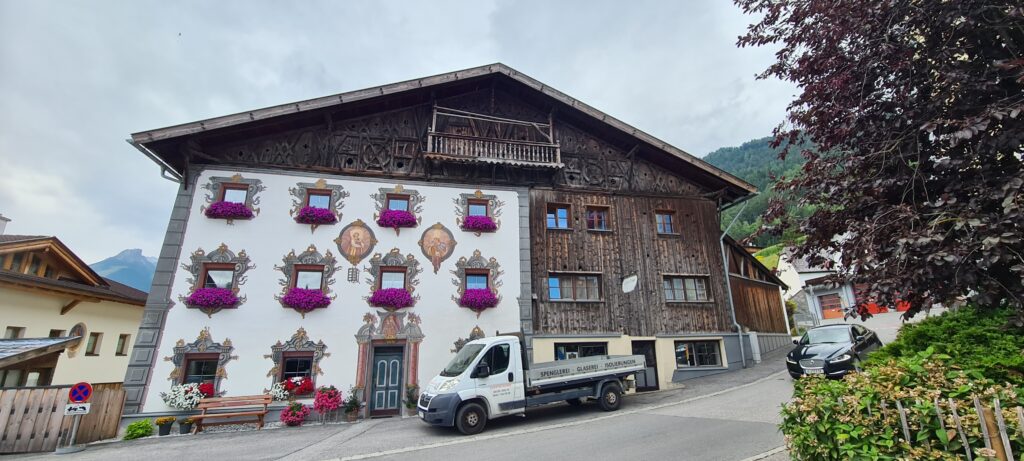 Questa casa contadina sorge nel centro di Fulpmes, nella Stubaital.  La costruzione viene fatta risalire al 17. secolo ed è caratterizzata dalla presenza, in un unico edificio diviso verticalmente, della parte agricola e di quella destinata ad abitazione.  La facciata, elaborata in epoca successiva, è in pieno stile rococò, come raccontano le ricche decorazioni delle finestre e della porta d’ingresso.  Fra elaborati festoni dipinti e coloratissimi fiori a cascata, quasi sfuggono  all’occhio distratto di un passante le figure dei Santi protettori di questo magnifico edificio.