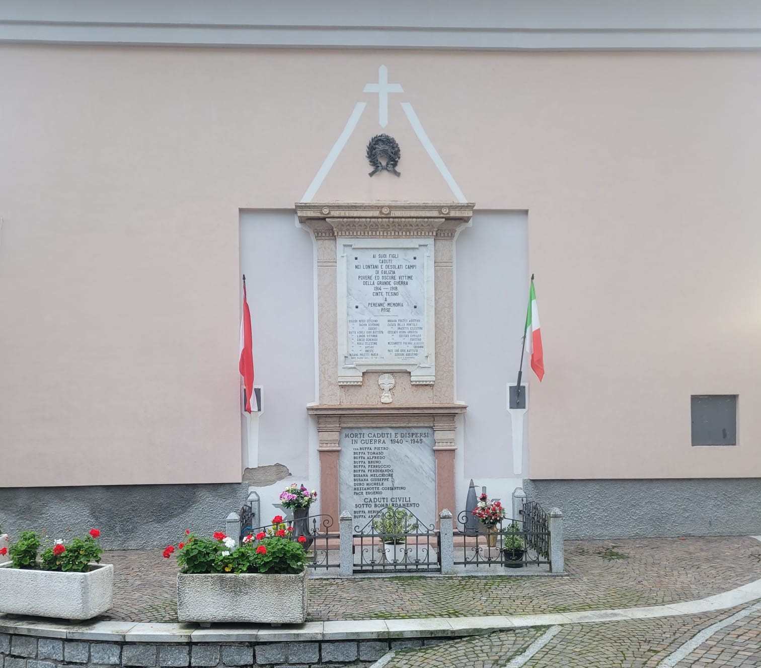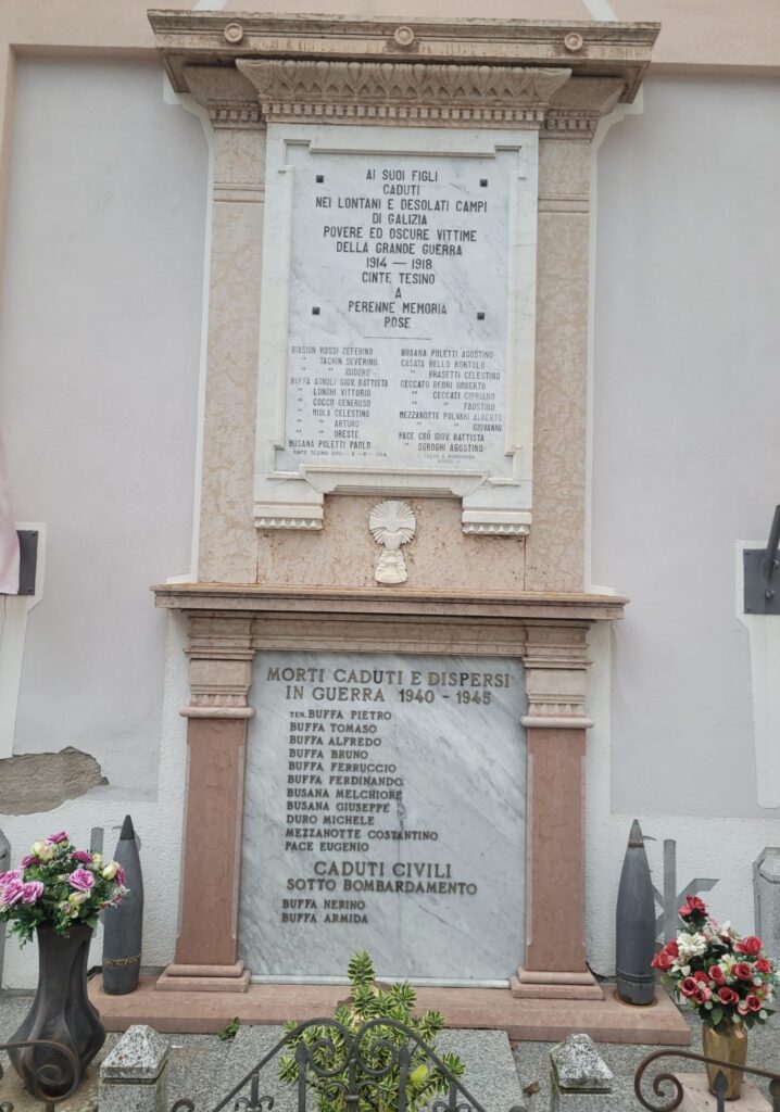 Due le lapidi dedicate ai caduti. Quella inferiore ricorda gli abitanti di Cinte, militari e civili, morti durante la seconda guerra mondiale. Quella superiore, invece, è in onore dei caduti della Prima Guerra, elencati in ordine alfabetico con cognome e casato. Ma quello che salta agli occhi è l’epigrafe attuale che, pur conservando alcuni passaggi di quella del 1924, ha un suono completamente diverso e molto più vicino al vero sentire della comunità: