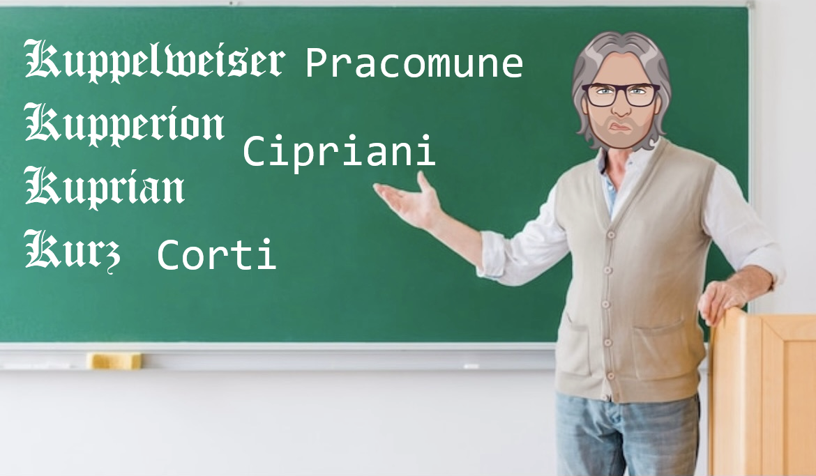 Con Kurz, l’estroso ometto italico non ha dovuto sforzare l’eccentricità delle sue elucubrazioni: Kurz tradotto in italiano sarebbe “corto” o “breve” … e quindi? E dunque? Beh, dovendo scegliere tra Brevi e Corti, scelse Corti ovviamente. (continua)