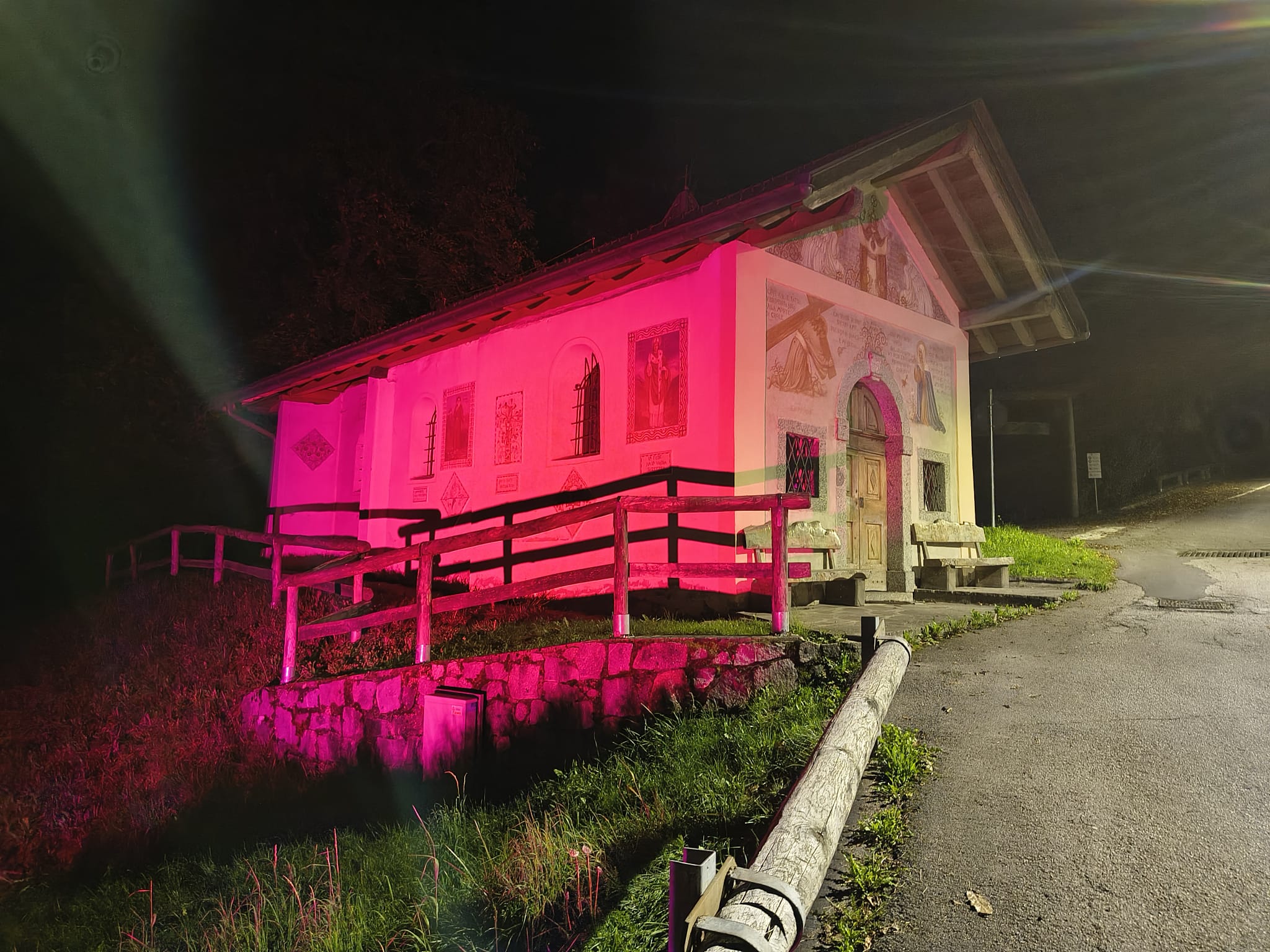 La Chiesetta di Pafsang è illuminata di rosa. Con questo simbolico gesto, anche il Comune di Porte di Rendena aderisce al mese dedicato alla prevenzione del tumore al seno. LILT for Women – Campagna Nastro Rosa è l’iniziativa che invita tutte le donne a rivolgersi al numero verde SOS LILT 800 998877 per ricevere informazioni e prenotare una visita senologica gratuita presso il più vicino ambulatorio LILT aderente.