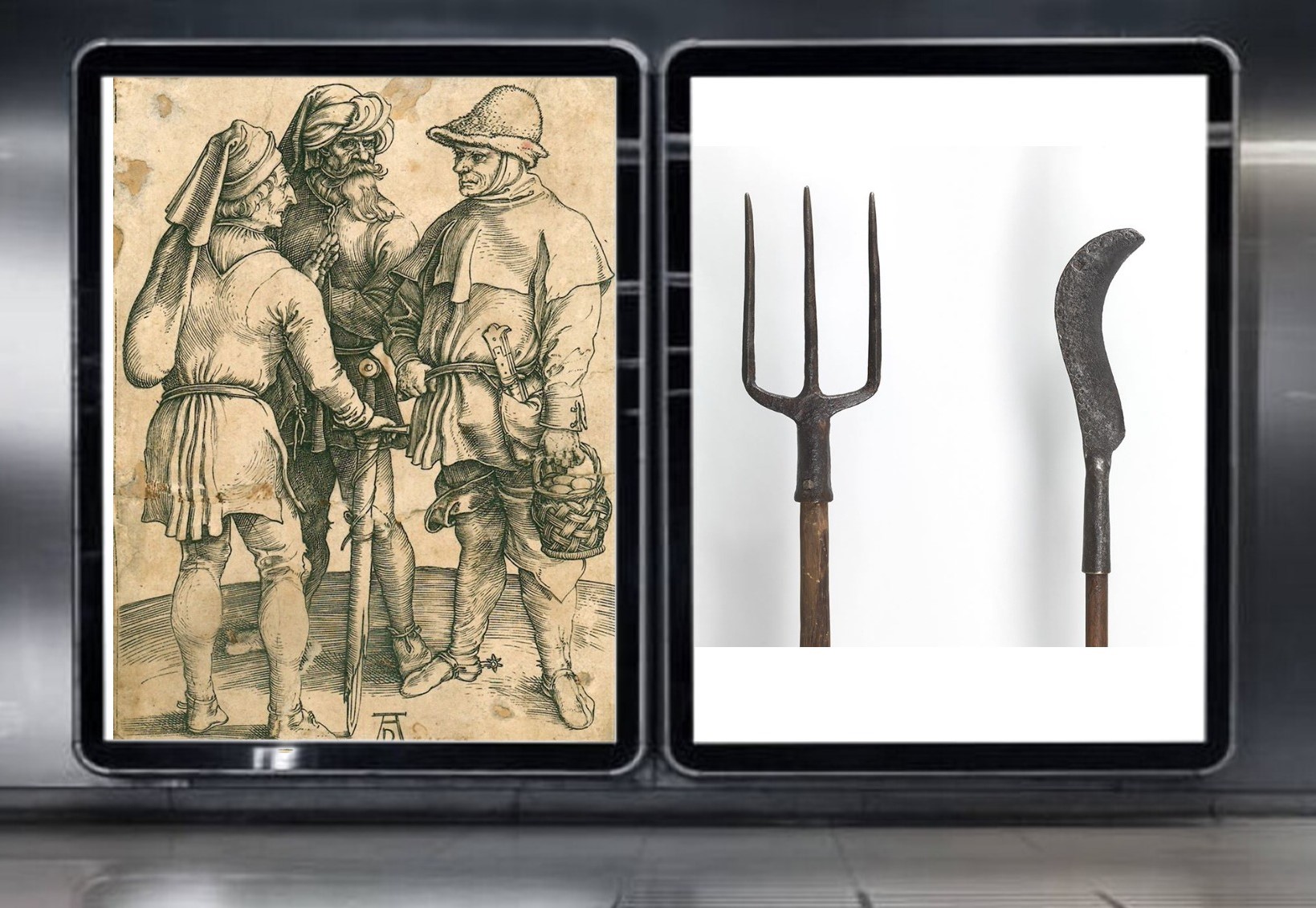 L’allestimento si sviluppa in più sezioni tematiche, che intrecciano punti di vista diversi. Le rappresentazioni del contadino, ora umile lavoratore ora “povero diavolo”, introducono alla tensione tra realtà e immaginario sociale. I paesaggi delle valli e le chiese, protagonisti e al tempo stesso vittime dei disordini, evocano la dimensione territoriale della rivolta. Le armi improvvisate dai contadini e quelle degli eserciti professionali mostrano lo squilibrio di forze, ma anche la determinazione dei ribelli.