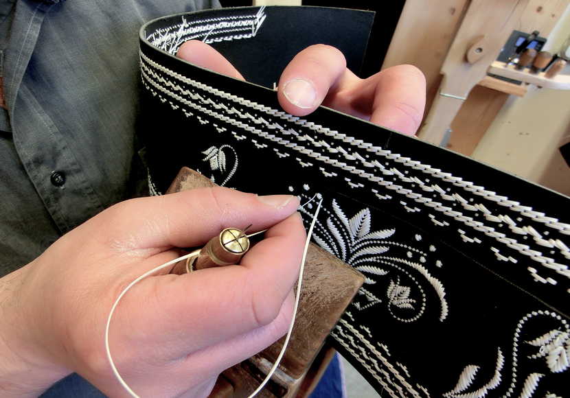 Das Arbeiten mit Ahle und den Kielen der Pfauenfedern erfordert nicht nur handwerkliches Können, sondern auch Geduld und ein gutes Auge. Loch für Loch wird von Hand gestochen, und der Kiel durchgezogen.