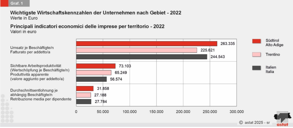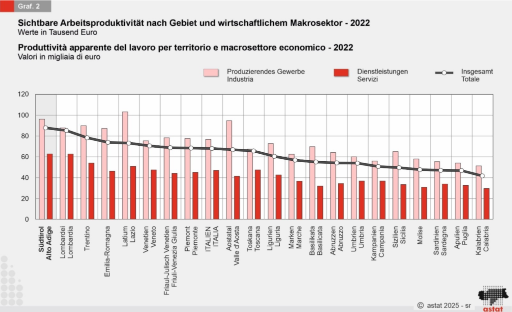 Die betriebliche Wertschöpfung steigt im Vergleich zu 2021 um 16,3 Kauf 15,2 Milliarden Euro. Die sichtbare Arbeitsproduktivität, also die Wertschöpfung pro Beschäftigtem, liegt bei 73.100 Euro, der höchste Wert in ganz Italien. Dahinter folgen die Lombardei mit 71.000 Euro und Welschtirol mit 65.200 Euro. Der nationale Durchschnitt beträgt 56.600 Euro, den niedrigsten Wert verzeichnet Kalabrien mit 34.700 Euro.